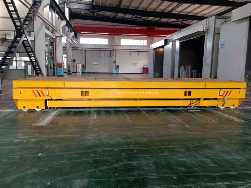 在現(xiàn)在的自動化生產(chǎn)車間,常常會見到很多的交叉軌道,這樣的交叉軌道不只是讓不同軌道上的車輛各自行走,還要求不用的軌道之間互相交換,來實現(xiàn)不同軌道上的車輛將物件運輸?shù)浇徊孳壍赖墓ぷ魑恢蒙?,針對這種工況,百分百公司設(shè)計了十字交叉平移換軌地平車。
